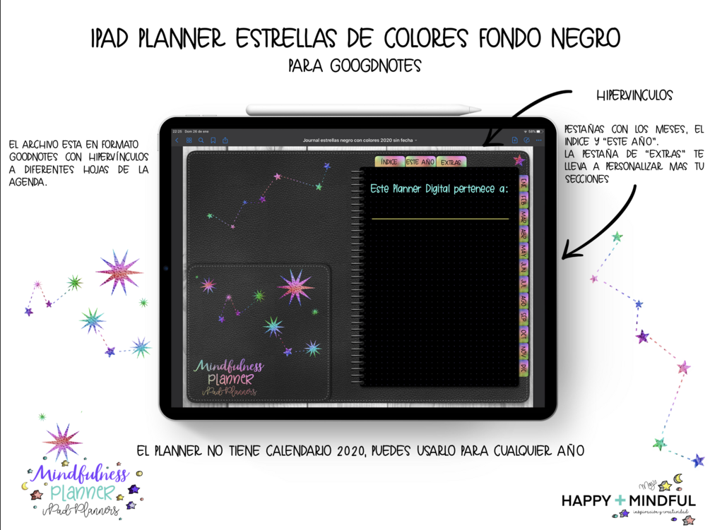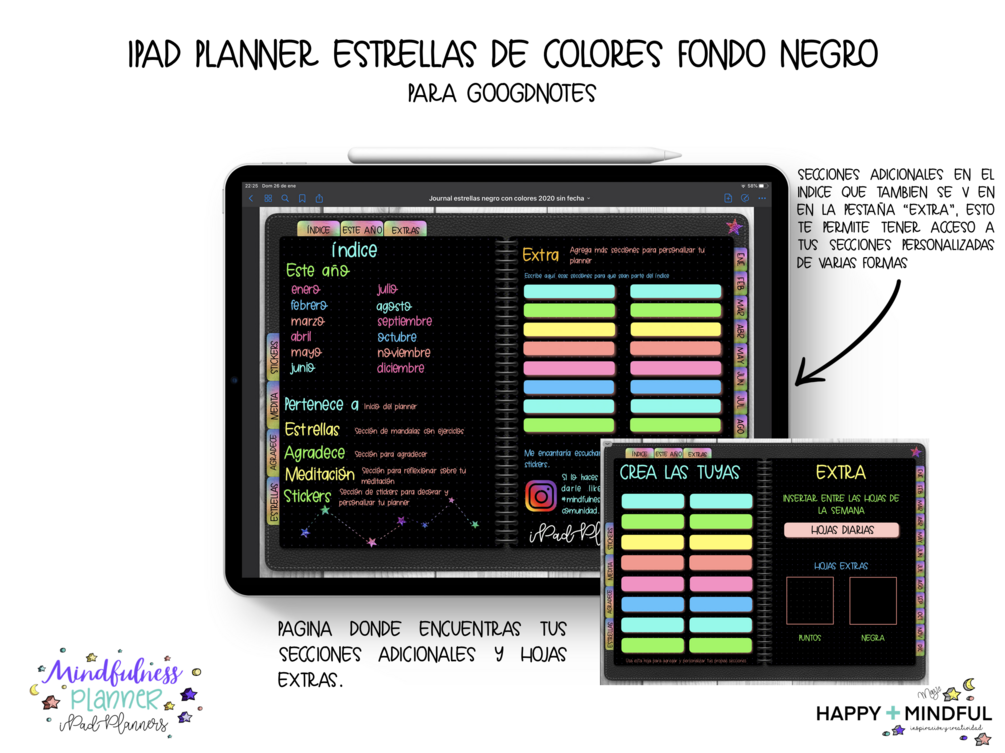 Obtienes un iPad Planner en formato Goodnote, Stickers inslcuidad y Happy Mindful Font de regalo.